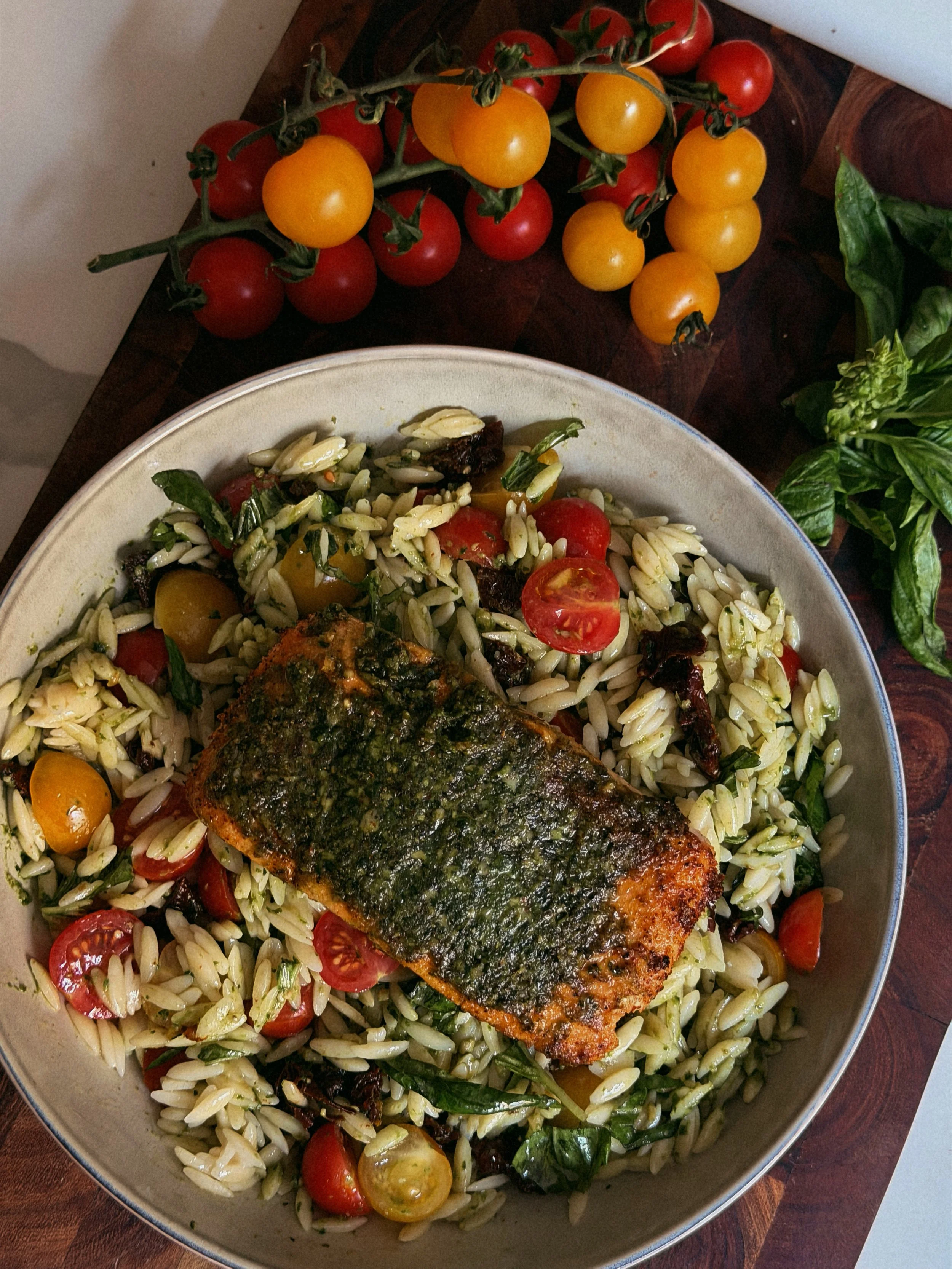 Consider this your soft launch into summer cooking. Pesto salmon paired with a bright, herby orzo salad —fresh basil, cherry tomatoes, sun-dried tomatoes, and a generous spoonful of pesto bringing it all together.